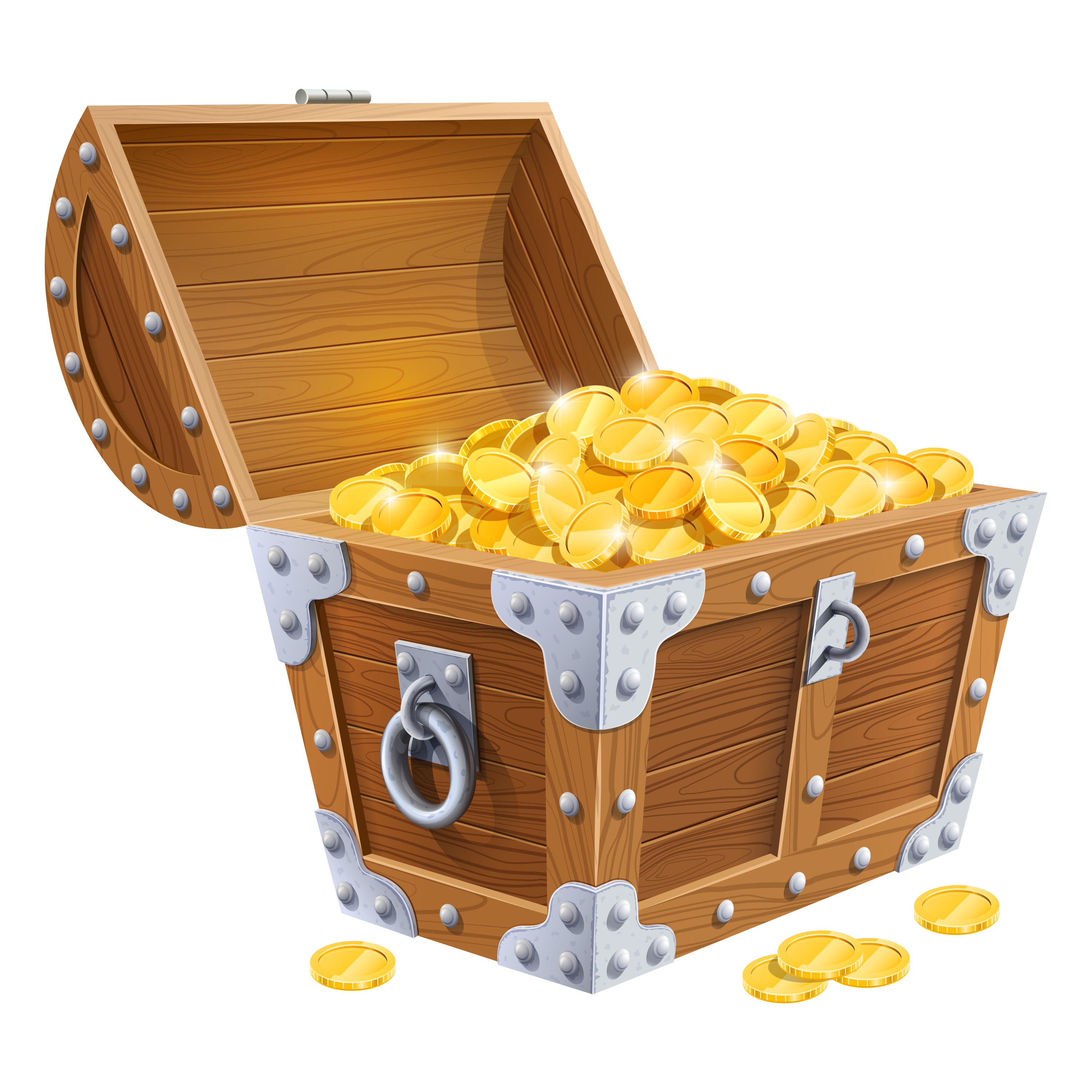 Изображение сундука с золотыми монетами без фона в PNG формате. Реалистичный деревянный сундук, наполненный золотом, идеально подойдёт для дизайна игр, иллюстраций к пиратской тематике, рекламных баннеров, постеров или инфографики, связанной с деньгами и богатством. Картинка на прозрачном фоне легко вставляется в любой макет, будь то сайт, презентация или печатный материал.